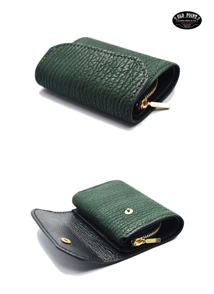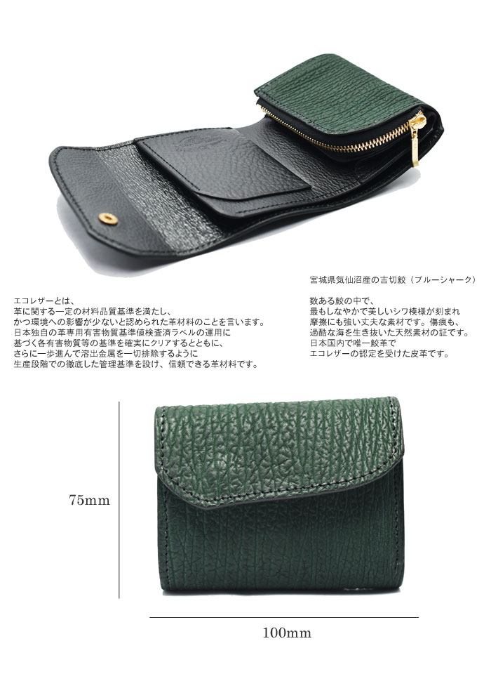 ■商品説明 ■メーカー名: OLD POINT オールドポイント -匠 Takumi- ■品名:三つ折りミニウォレット ■カラー/素材: 外装:グリーン【GRN】/シャークスキン・鮫革 内装:ブラック【BLK】/シュリンクレザー・牛革 裏貼:ブラック【BLK】/豚革 ■サイズ:H100×W75mm ■ホック:プリムホック ■縫製:ミシン ■収納:マチ付きカードポケット×1、カードポケット×1、小銭入れ×1、札入れ×1 ■店長コメント OLD POINT オールドポイント -匠 Takumi-は、 国内屈指の技法を持つトップクラフトマンに作製を依頼した拘りのハンドクラフト製品を展開する カオスオリジナルブランドです。