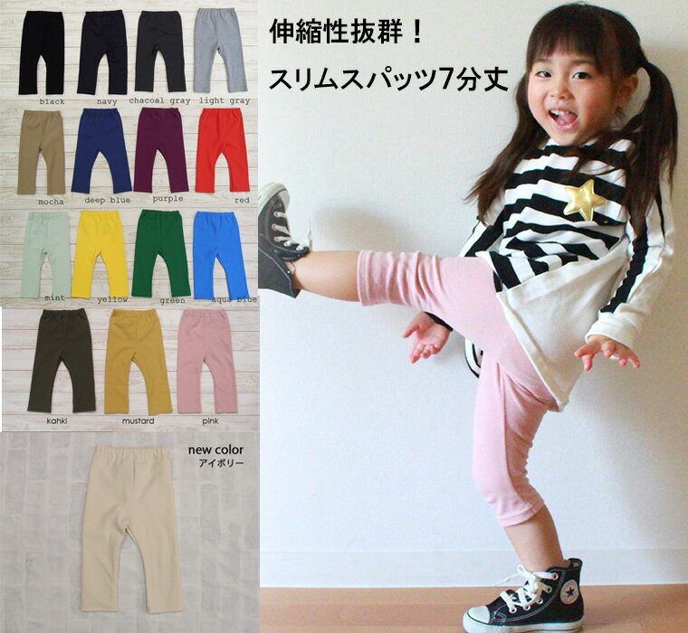 カラー パープル ネイビー レッド グリーン イエロー ブルー ライトグレー チャコールグレー ブラック ミント モカ アクアブルー 商品説明 この上ない伸縮性とっても履きやすいスリムパンツ! 春夏に最適な7分丈(キッズサイズ)登場!!!! 販売してすぐに楽天ランキング1位を獲得した スリムスパッツ(10分丈)に少し涼しいときに履ける短めのバージョンが登場しました。