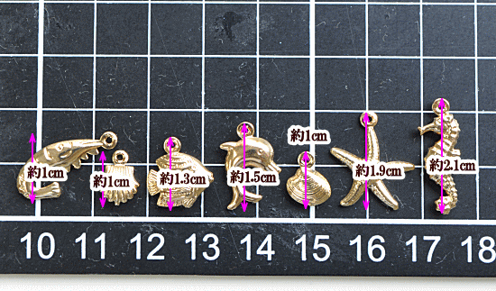 おすすめその他チャームはこちらからアクセサリー作りに必要な材料はこちらから↓サイズをご確認下さい↓ヒトデのチャームのみ、裏面が平らですが、他は表と同じで立体的になっております。