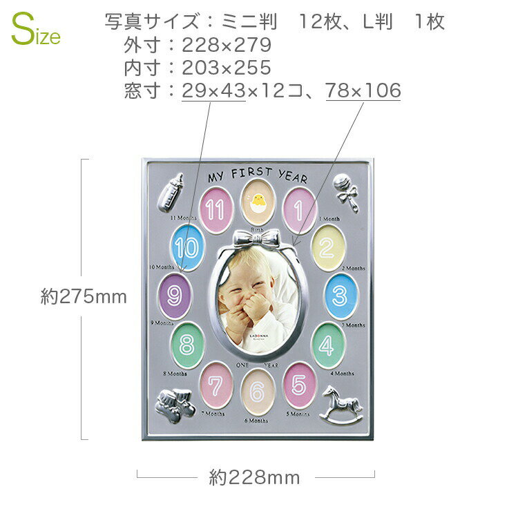 価格別商品をみる [〜3000円] 価格別商品をみる [〜5000円] 価格別商品をみる [5000円〜] 価格別商品をみる [1000円〜2000円] 商品名 フォトフレー ベビー 写真 成長記録 フレーム シルバー MB21-130 素材 スチール、ペイント サイズ ●写真サイズ:ミニ判 12枚、L判 1枚 ●外寸:228×279 ●内寸:203×255 ●窓寸:29×43×12コ、78×106 商品説明 おしゃれで可愛いベビーフレームでメモリアルを! 誕生から1歳までの写真を飾ることができる「成長記録フレーム」です。