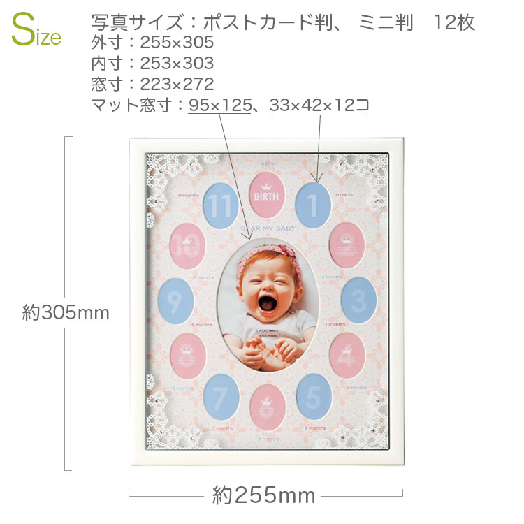 大人気の12ヵ月ベビーフレームに、レースやクリスタルでキラキラたっぷりおめかししたキュートなデザイン。