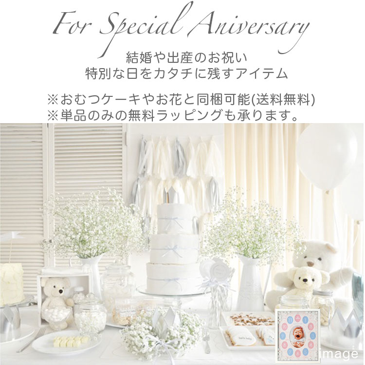 出産祝いに最適◎ 思い出の写真を入れるのはもちろん、お気に入りのポストカードを入れてお部屋に飾るのも◎ ※こちらの商品はおむつケーキとの同梱が可能商品です。